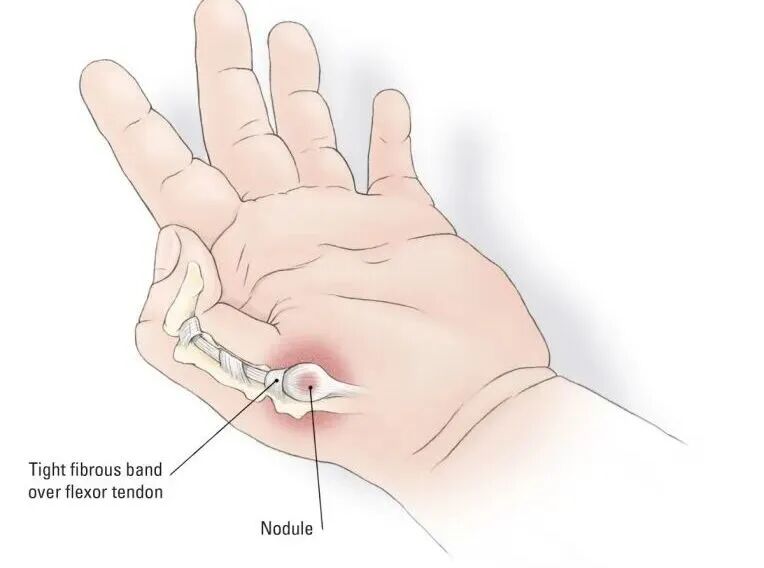 通俗地说,就是控制拇指弯曲的肌腱(屈指肌腱)在一个叫做“腱鞘”的管道里卡住了,无法顺畅地滑动。